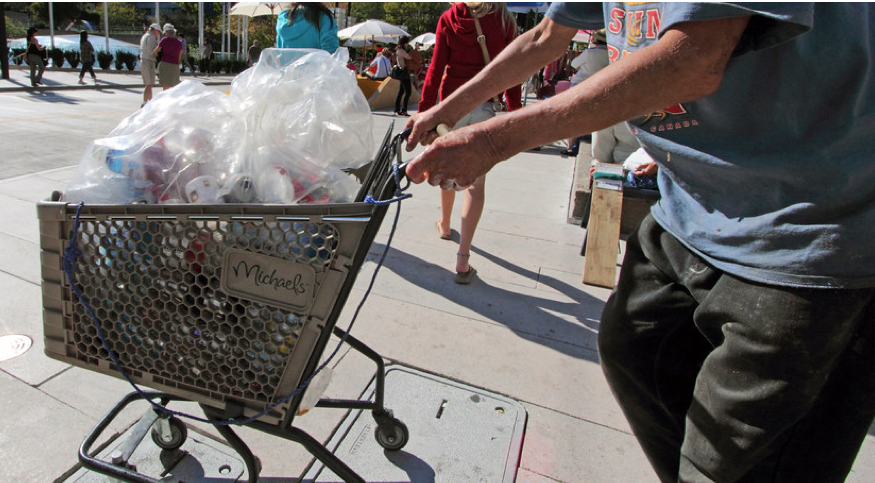 I saw a shopping cart most likely stolen or permanently borrowed from a local market parked on the sidewalk, unattended and loaded with empty plastic bottles and a variety of other recyclable items. The “owner” of the cart was scavenging in the trash cans looking for recyclables.