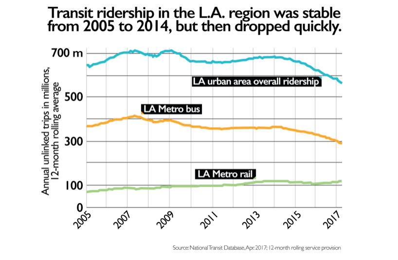 Yes, METRO has rapidly expanded its urban rail lines and partnered with the City of Los Angeles to build thousands of new units in “transit oriented developments,” but this has not made a difference. In fact, METRO’s bus ridership has been in steady decline since 2009, and it is now back to 1985 levels. As for rail and subway ridership, it has been flat since 2014.