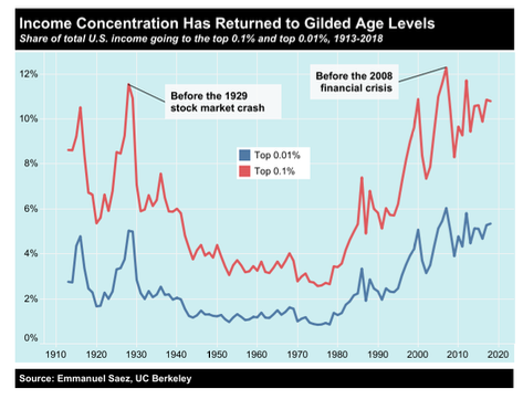 UC Berkeley economist Emanuel Saez has documented how economic inequality in the United States increased from it low point in the late 1970s, to its current level, which matches the 1920s. According to Prof. Saez, the top .1 percent (.001) of earners have incomes that are, on average, 196 times greater than the bottom 90 percent. If we look more closely at this 90 percent, 140 million of them live in official or unofficial poverty.
