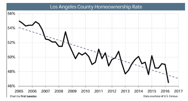At this point, these former house and condo owners no longer accumulate equity and tax benefits from deductible mortgage interest and property tax payments. The percentage of their income they must pay for housing has increased, but it only covers their rent since mortgages are far beyond the financial reach of most Los Angeles tenants. Rent extraction is now so pronounced in the United States that the home ownership rate has plummeted to an historic low, especially in Los Angeles, the U.S. city with the lowest homeownership rate.