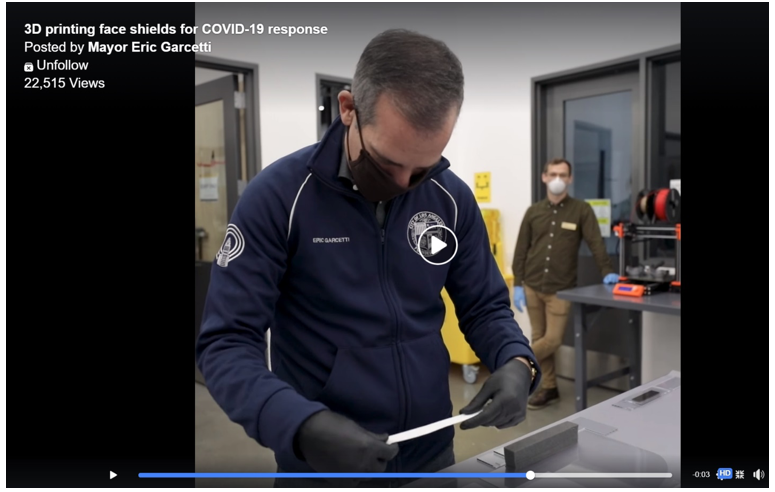 (Photo courtesy of FACEBOOK – screen shot of video of Mayor Eric Garcetti working on face shields for the COVID – 19 response.)