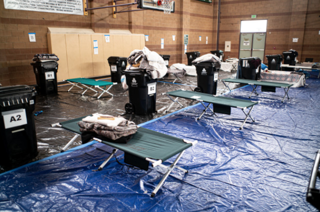 “Cots are spaced at least 6 feet apart at the Granada Hills Recreation Center Wednesday, March 25, 2020. The center has been converted in an emergency homeless shelter with medical personnel during the day, police presence, temperature checks and other features amid the coronavirus pandemic. (Photo by David Crane, Los Angeles Daily News/SCNG)”