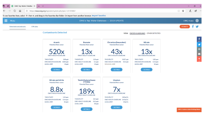 “Includes chemicals detected in 2015-2017 for which annual utility averages exceeded an EWG-selected health guideline established by a federal or state public health authority; chemicals detected under the EPA's Unregulated Contaminant Monitoring Rule (UCMR 3) program in 2013 to 2015 (and subsequent testing when available), for which annual utility averages exceeded a health guideline established by a federal or state public health authority; radiological contaminants detected between 2012 and 2017.”