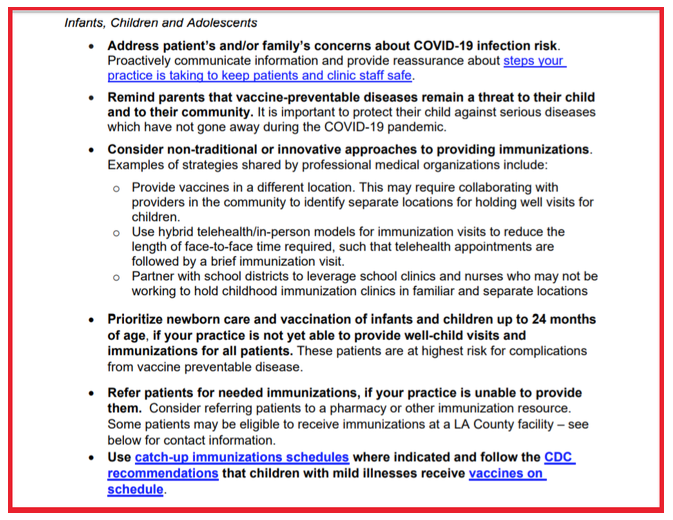 “Refer patients for needed immunizations, if your practice cannot provide them. Consider referring patients to a pharmacy or other immunization resource. Some patients may be eligible to receive immunizations at a LA County facility – see below for contact information.”