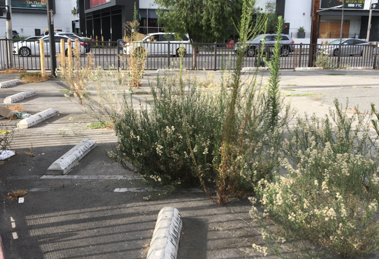 Heyday for weeds. When stores shut down and landlords walk away from their properties, weeds quickly take over. The photo above shows what a few months of economic collapse looks like at a prime commercial corner on the westside of Los Angeles. (Third Street & LaCienega) Like viruses, these flowering weeds reveal that Mother Nature gets the last laugh in our economically fragile society. The former parking lot shown in the picture, like the store’s former employees, is doomed, even if the property eventually gets a trickle-down zone change.
