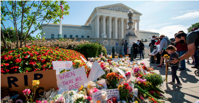 (Photo above: People place flowers outside of the US Supreme Court in memory of Justice Ruth Bader Ginsburg, in Washington, DC, on September 19, 2020. Ginsburg died September 18, opening a crucial vacancy on the high court, setting off a pitched political battle at the peak of the presidential campaign. (Photo: Jose Luis Magana/AFP via Getty Images)