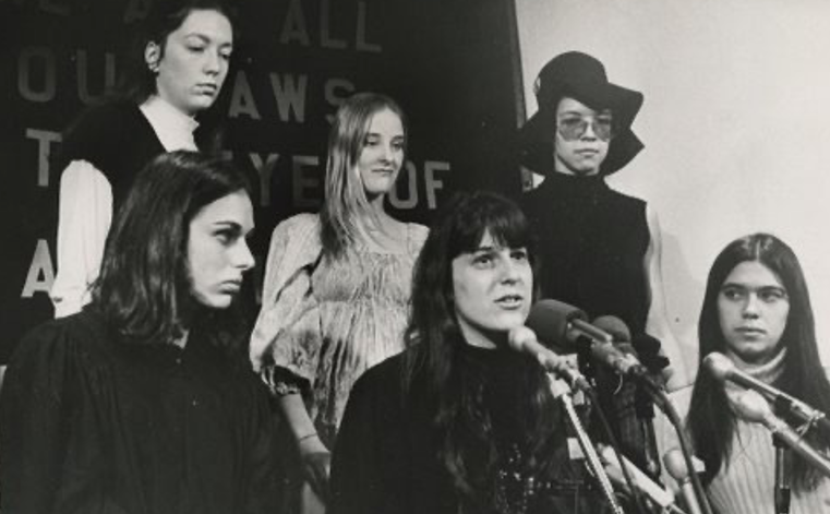 After the guilty verdict and contempt sentences the judge threw the defendants immediately into jail, and Anita Hoffman, Tasha Dellinger and I burned judges robes at a press conference underneath a huge banner — “We Are All Outlaws In the Eyes of America”— and helped organize a large protest. I spoke alongside attorney Bill Kunstler at Santa Barbara the day the citizens of that town burned down the Bank of America. So we were there, even if invisibly, as women often are. (Photo above: Standing: Ann Froines, Michele Dellinger, Sharon Avery. Seated: Anita Hoffman, Nancy (Rubin) Kushman, Susan Schultz. (Conspiracy trial) (Sun-Times photo).