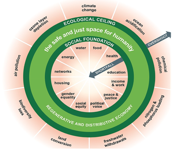 The doughnut economy is displayed in a visual circular schematic with a green inner circle, which represents a “regenerative and distributive economy that is a safe and just space for humanity” surrounding a list of items that, when in shortfall, need to enter the green doughnut’s “social foundation,” like housing, energy, water, health, income & work, etc. At the outer edge of the doughnut, an “ecological ceiling” lists “ecological overshoots” that threaten the social fabric.
