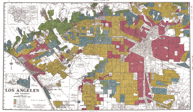 Map of historic redlining in LA, banned by Congress in 1968 through the Fair Housing Act.