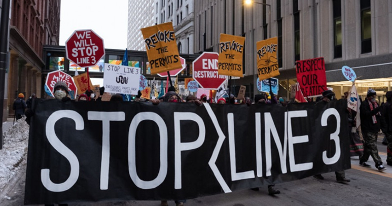 Across the country, people are protesting, sending letters, and making calls to demand that President Biden shut down the construction of Line 3 just as he called for the shut down the Keystone XL pipeline in January. They are also demanding that banks, insurance companies and pensions divest from Enbridge, the pipeline owner. (Photo above: Protests march through downtown St. Paul, MN with a Stop Line 3 banner on January 29, 2021. (Photo: Tim Evans/NurPhoto via Getty Images)