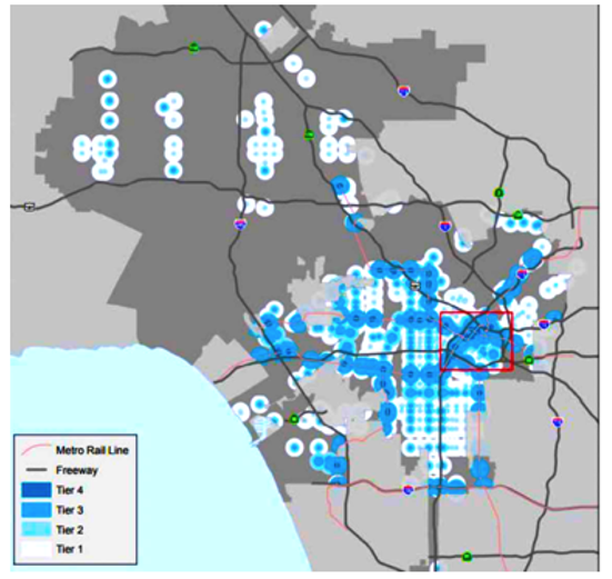 Official map of TOC Guidelines and Tiers in Los Angeles.