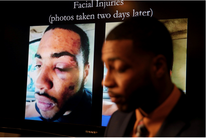 The officers allegedly confronted Ballew because his car had no front license plate, but they quickly escalated the encounter by handcuffing him, beating him with a metal baton, and punching him in the head. At one point Esparza put his hand on his holstered gun, which could have led to Ballew’s death – even though he had done nothing wrong and was not putting up any resistance. Ballew, who suffered a broken leg and injuries to his head, feared for his life. He was arrested for assault on a police officer, but was not formally charged due to “a lack of evidence.” That’s because the only evidence of wrongdoing was by officers Esparza and Lujan. “I was beaten as if I was a runaway slave,” Ballew later said.