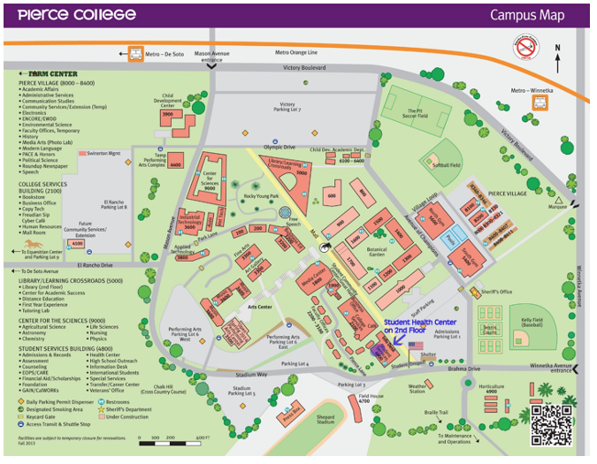 Los Angeles Pierce College map shows the Mason entrance at the top of the page. This parking lot – Parking lot 7 is just south of Victory Boulevard.