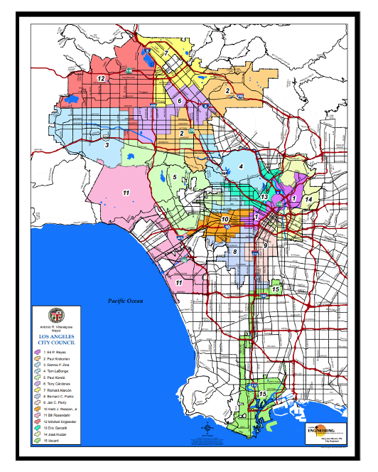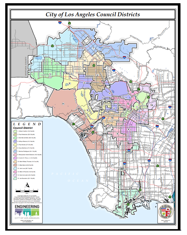 Above is a current map of the City of Los Angeles by City Council District. Of importance to note that meetings specific to Council Districts begin on July 1, 2021.