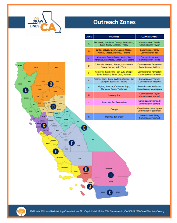 “We Draw the Lines” – California Citizens Redistricting Commission map by Outreach Zone.