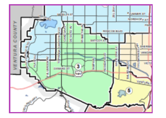 In the first map second from the top of the City of Los Angeles, you can see Council District 3 with Woodland Hills to the West and moving north into Canoga Park, and Winnetka.
