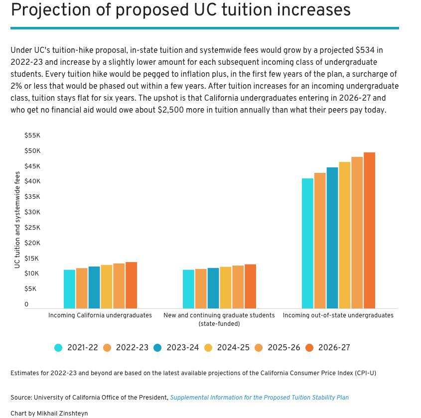 The UC president’s office projects soaring costs totaling $2.1 billion by 2026-27 on top of current expenses, a shortfall it argues must be plugged with tuition hikes along with more money from the Legislature. The new added revenue would pay for more faculty hires, salary and benefits increases, plus a slew of student support services and programs aiming to boost graduation rates.
