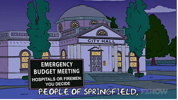 Scene from The Simpsons on a municipal emergency budget hearing.