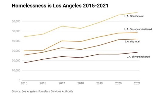In February of this year approximately 69,000 people were homeless in Los Angeles County and 42,000 in the city of Los Angeles. Countywide the homeless population increased by 4.1 % over 2020 and 25.9 % since 2018-2020. In the city the numbers were similar, a 1.7 % increase from 2020 and a 32% increase from 2018-2020.