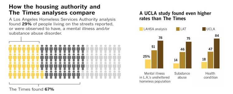 Los Angeles city officials have downplayed rates of substance addiction and mental illness within the homeless community for years. The reason still eludes me, but I suspect it has something to do with drawing attention away from the extent of the disaster that it really is. Most outside agencies and statistics cite numbers up to more than three times as high. Even the LA Times and UCLA contradict County and City narratives in two 2019 studies.