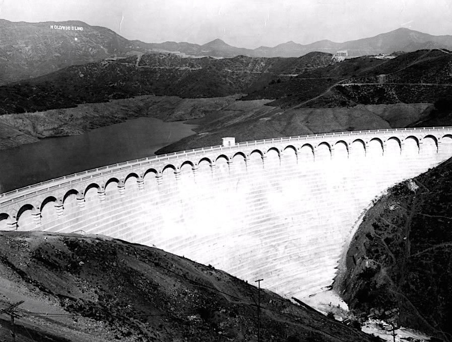 Previously, Hollywoodians were all up in arms over an imminent disaster. On March 12, 1928, the St. Francis Dam in Santa Clarita Valley burst just 12 hours after William Mulholland, chief engineer of the Bureau of Water and Supply, later made infamous in Chinatown starring Jack Nicholson and Faye Dunaway, had declared it safe. A year’s worth of Los Angeles water flooded through the Valley killing 400 people before making its way to the ocean near Ventura. 2022, Water and Power Associates, Mulholland Dam and Hollywood Reservoir.