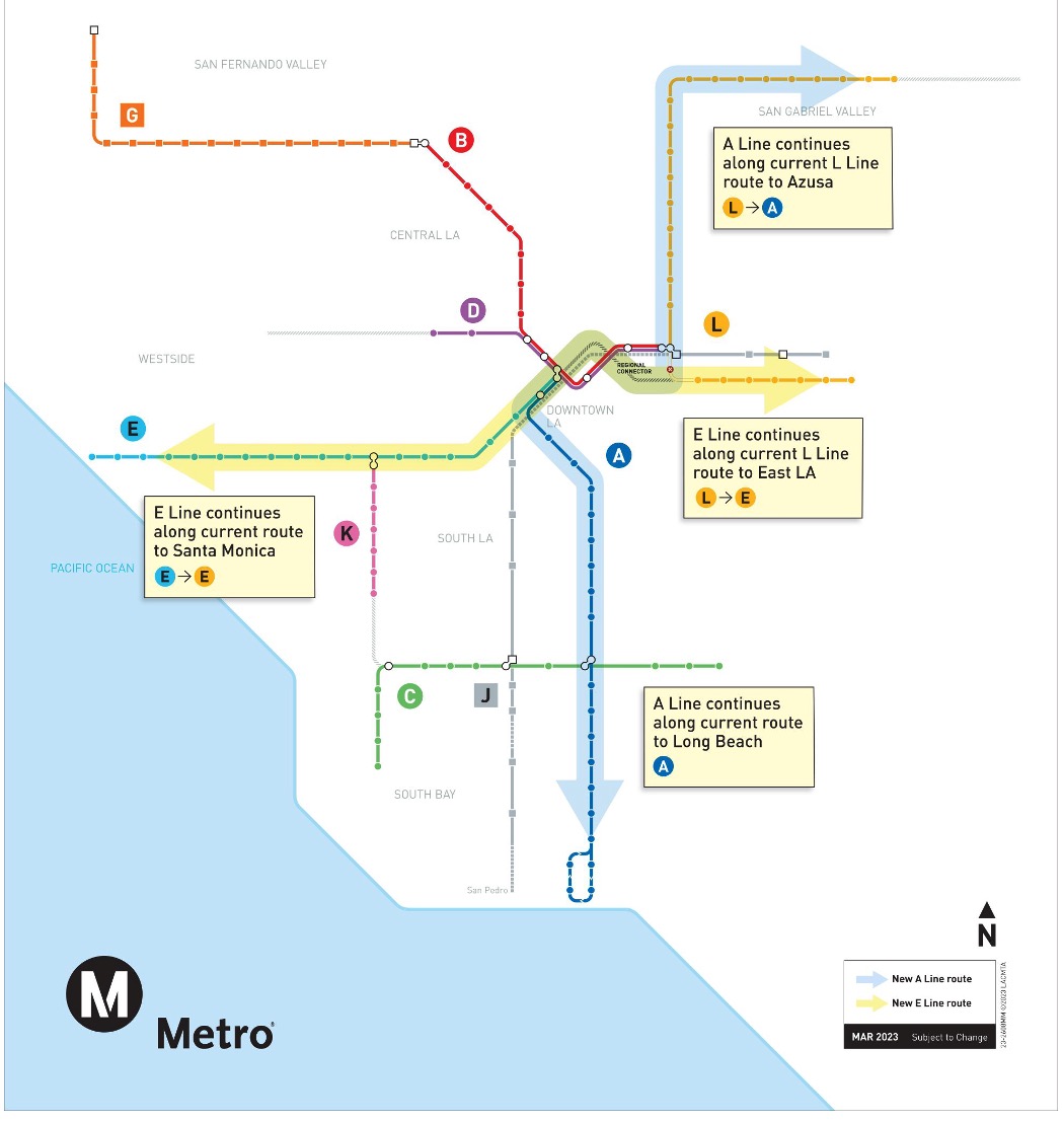 Well, we now have a non-transfer, single-seat ride from the Ocean to East L.A., and a non-transfer, single-seat ride from Downtown Long Beach to the Inland Empire. Easy access from the San Gabriel Valley to Long Beach. Easy access from Pasadena to the beach. And easy access to the Wilshire Blvd. and San Fernando/Universal Studios subways.
