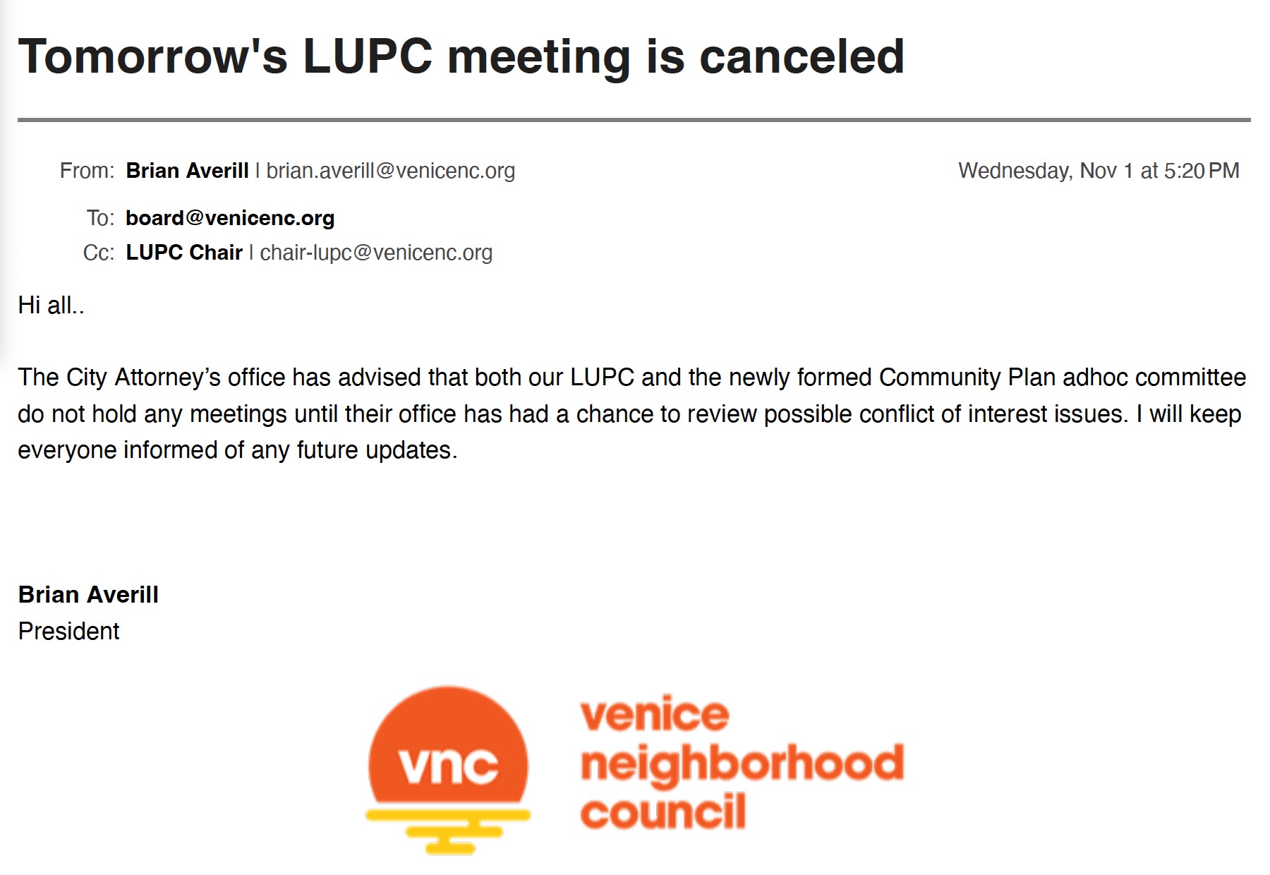 On November 1, the VNC President emailed the entire VNC Board and instructed us that the City Attorney’s office advised that LUPC and the recently approved ad hoc committee relating to the CP/LCP not meet until it completed review of possible conflict of interest issues. Additionally, I understand that the VNC cannot take up any recommendations from either committee.