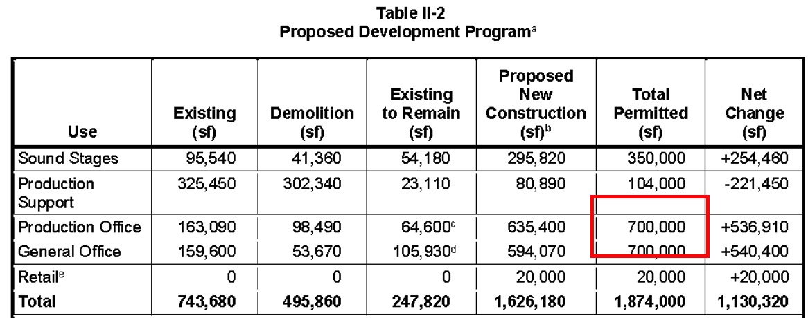 This table identifies 1.4 million square of office space out of a total of 1.874 million square feet. A whopping 75 percent of the proposed complex is office space – so, less a studio with offices than an office park with a studio component.