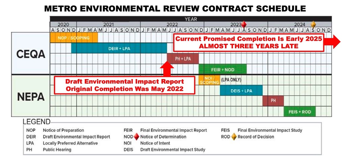 Metro has now fallen behind their official project schedule by almost three years – not just the two years noted in my question. Metro released their Notice of Preparation (NOP) for the Draft Environmental Impact Report (DEIR) on November 20, 2021, which kicks off DEIR preparation. They were scheduled to finish the DEIR in 18 months and release it to public by May 2022, as shown below on the Metro Environmental Studies Contract schedule obtained through a California Public Records Act request. At their recent May 11th public meeting, Metro announced the DEIR would not be released until early 2025. It has now taken Metro at least 50 months to prepare the document – almost three times longer than they originally promised. This significant slippage is highlighted in red on the schedule. Metro just keeps slipping and never tells the public about it.