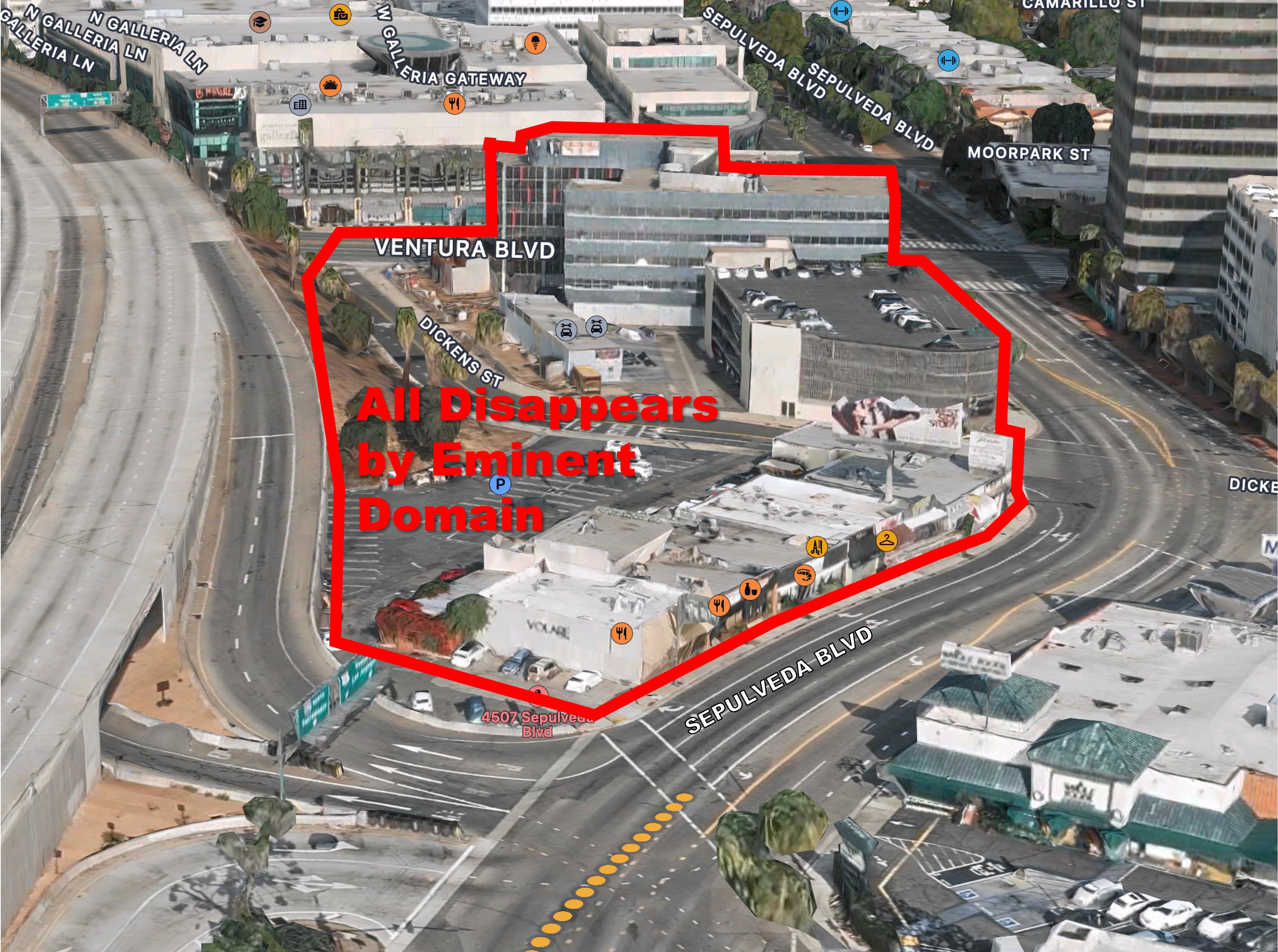 The large Metro rendering of a Valley “elevated subway” station posted on the wall at their July 2019 public meeting in Van Nuys scared everyone who saw it and raised many questions. Meeting attendees knew what’s at this location today (see below) and saw a five-story office building, three-story parking structure, businesses, and restaurants disappear to make way for an elevated station with zero parking. Further south, it was obvious the elevated tracks removed more than 100 apartments, condos, and houses. These are real, substantive eminent domain impacts.