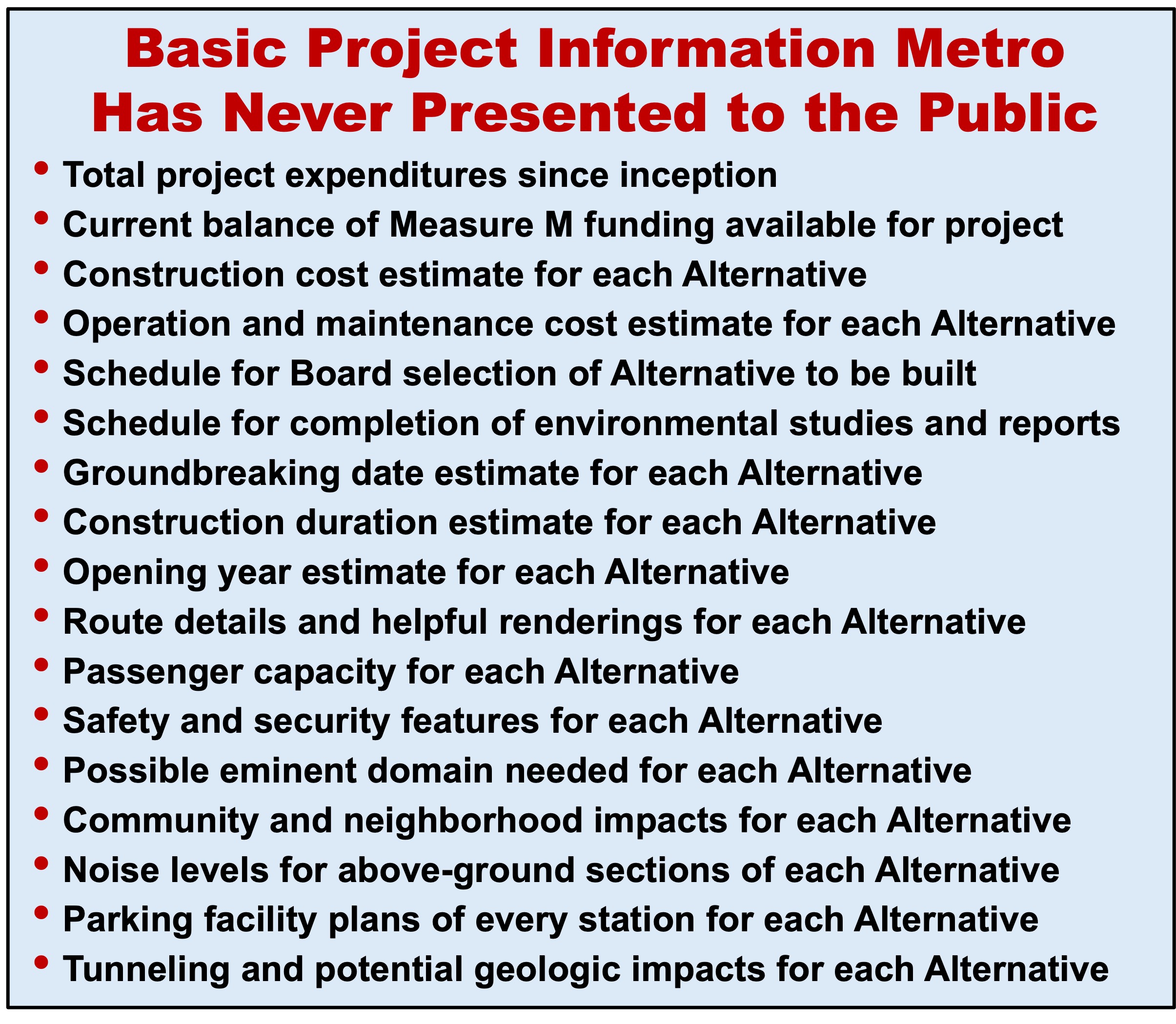 Withheld Information – The information that Metro hasn’t told the public about this project exceeds what they have told. They’ve withheld important basic information the public needs about the project’s six alternatives, such as how much each will cost, how long each will take to build, how Metro will finance their construction, and where eminent domain will be required. The long list at the right is only some of the basic information that Metro has never presented but keeps promising soon. We haven’t seen any of it yet.