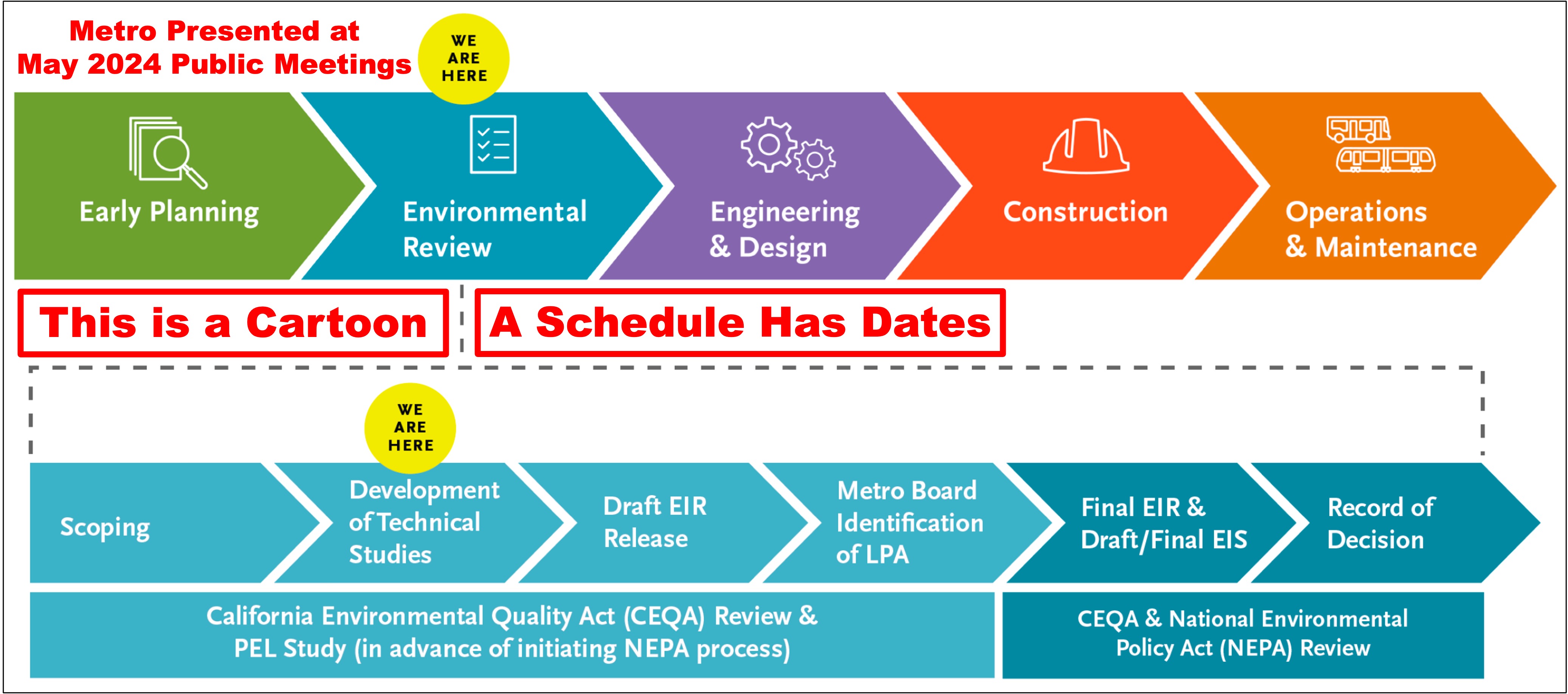 Trivial Information – Much of the information Metro presents at its pubic meetings is trivial, such as useless schedules and tiny no-detail route drawings. A great example is the “schedule” at the right that Metro presented at their May 2024 public meetings. This is not a schedule – it’s a cartoon with no dates and no scale. The public deserves a real schedule showing where the project is today and when it will be finished for each alternative – because some alternatives will take 10+ years longer to build than others.