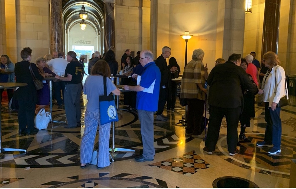 Photo of Budget Day guests enjoying a light breakfast at the L.A City Hall rotunda before the start of the Plenary on the City Budget.