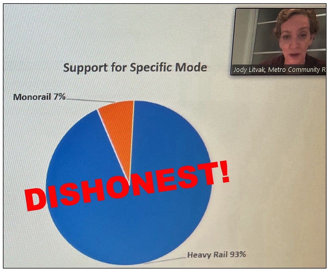 LA TRANSPO - The seventeenth of my 20 questions to Metro CEO Stephanie Wiggins asked: “Why did Metro present misleading, statistically unsupported data at its June 2022 Public Scoping Community Update webinar and purport it was statistically valid? Metro implied 93% of all the public supported heavy rail while only 7% supported monorail. This data and its supporting statistics appear nowhere in Metro’s Scoping Summary Report prepared by HTA Partners—probably because no competent contractor would publish such unsupported data. The presentation was misleading at best and potentially fraudulent at worst. Yet Metro Project Manager Peter Carter and Metro Community Relations Director Jody Litvak presented the data as if it was based on 100% of public comments that Metro received. It wasn’t. Less than 5% of public comments had to be twisted a bit to develop these figures. This is not honest conduct for a public agency.”