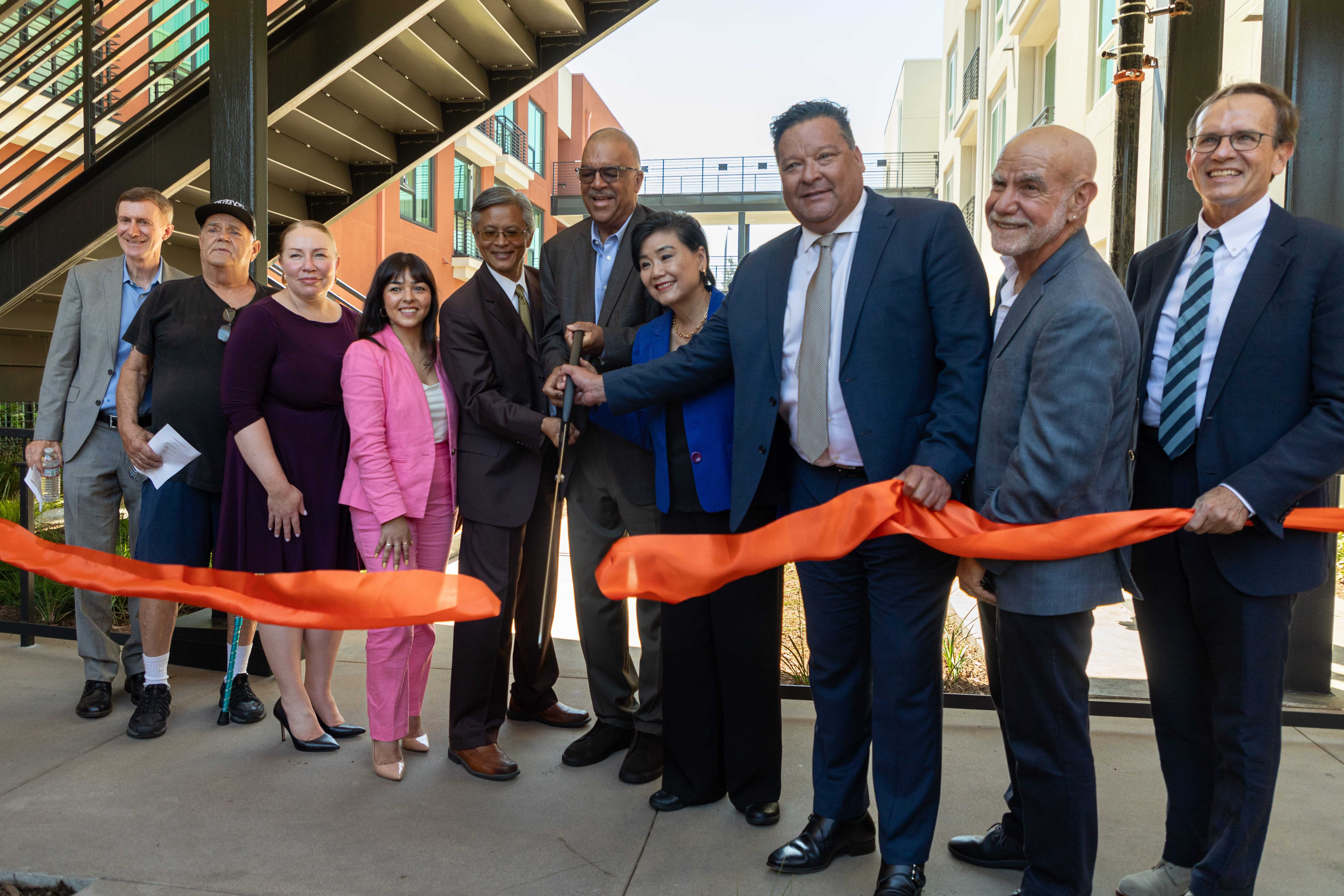 BRIDGE Housing President and CEO Ken Lombard cuts the ribbon at Heritage Square South, joined by U.S. Rep. Judy Chu, Pasadena Mayor Victor Gordo, and other dignitaries.