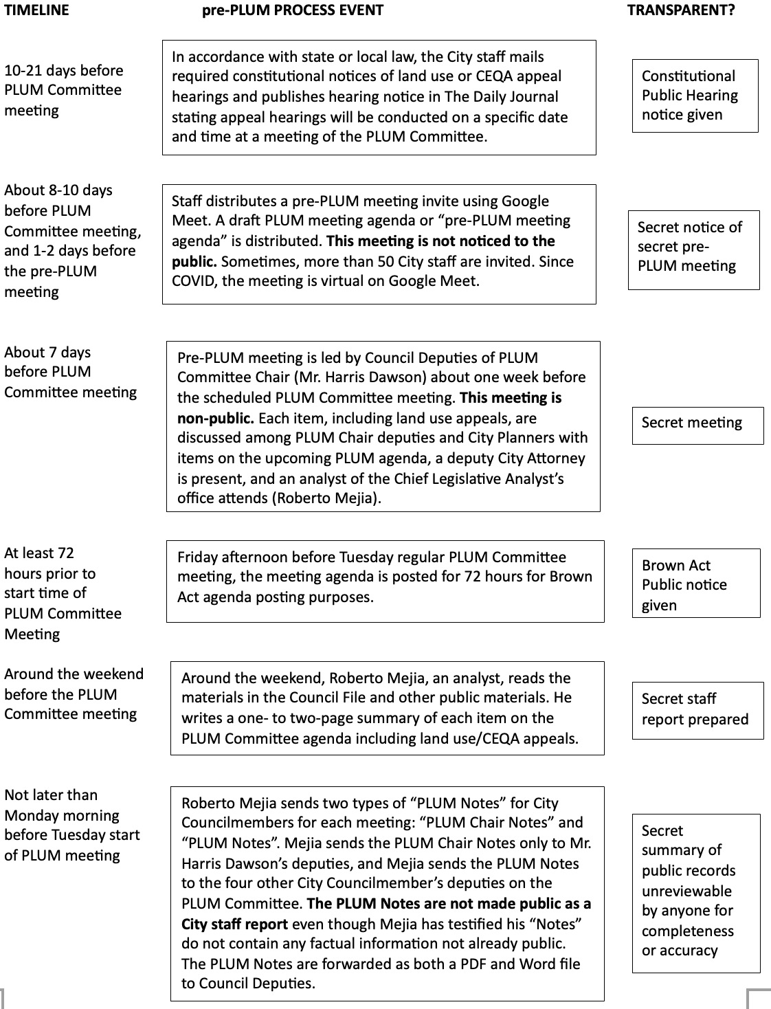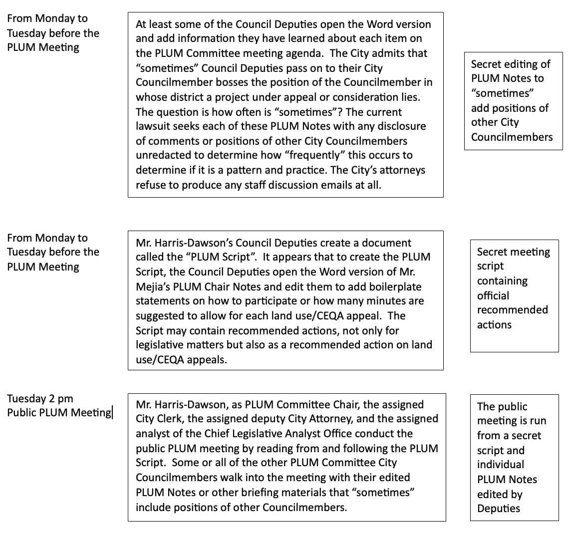 Let’s focus on what happens when Council Deputies of the remaining four members of the PLUM Committee receive Mr. Mejia’s CLA PLUM Notes. To assist, I provide a flowchart of the pre-PLUM process as we now understand it from the City’s discovery admissions and employee testimony submitted in public Court records, and notations regarding the lack of transparency to the public. [No. 4 – pre-PLUM flowchart - SEE BELOW].