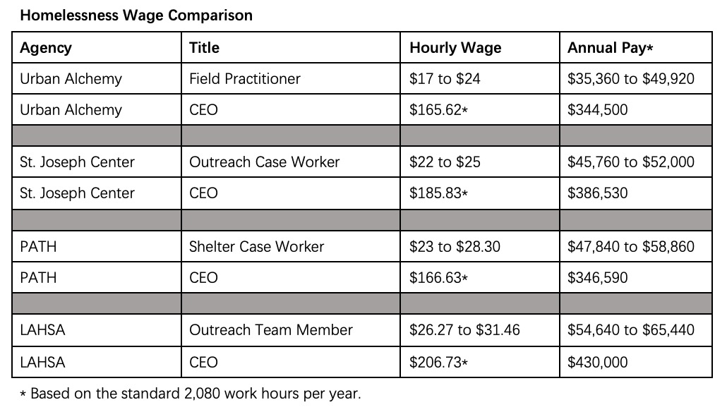 To associate numbers with the stories about low wages, I looked at four agencies’ employment opportunities for front-line employeess: LAHSA, Urban Alchemy, PATH, and St. Joseph Center. In most cases, the hourly pay was surprisingly low given the importance of the work. Then I compared those wages to the chief executives’ pay to give readers an idea of the differences in compensation.