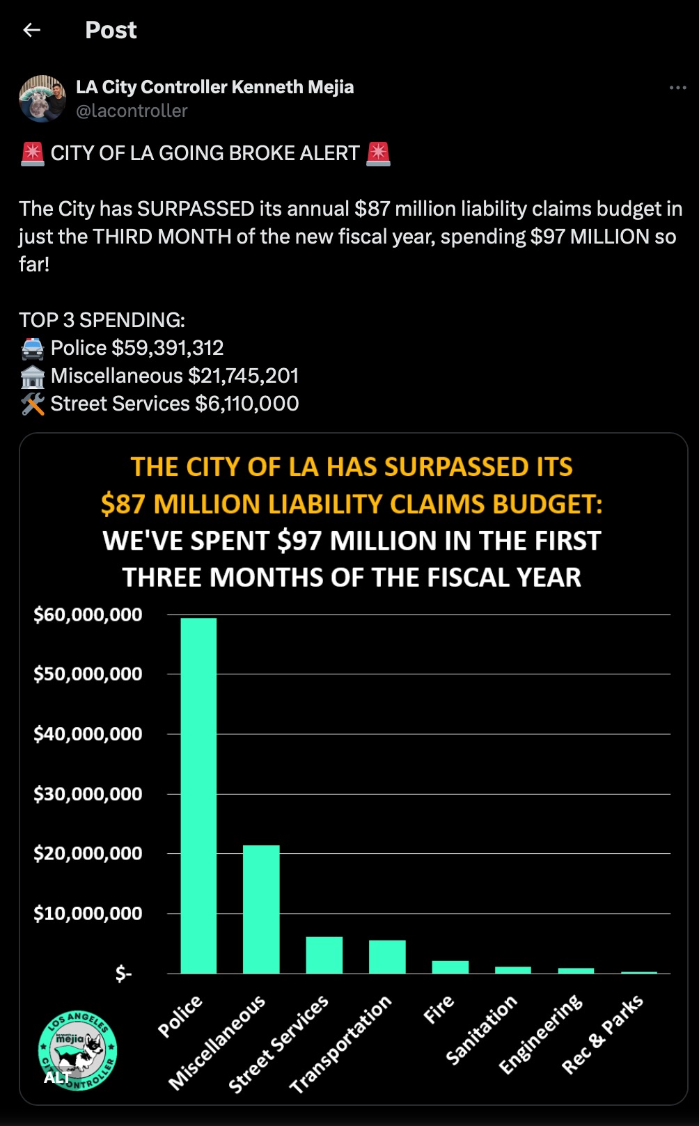 “Liability claim payouts [are not] taken out of the budgets of the individual City Department that gave rise to the liability – instead, they mostly come out of the General Fund which is mainly used to fund city services and resources for Angelenos, “ Mejia said. [actually that line was part of his social media posts]