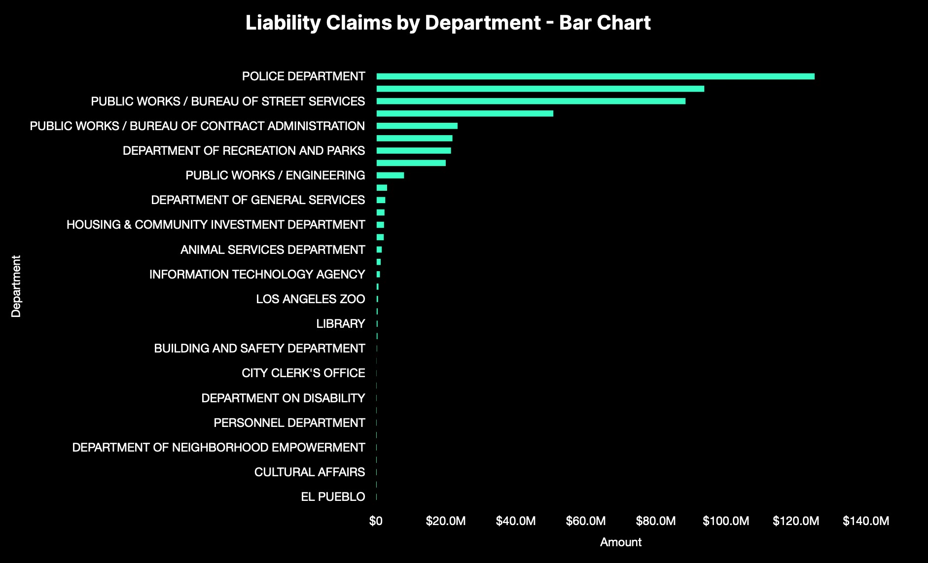 Also on Mejia's website, he has a bar chart showing “City of LA Liability Claim Payouts FY2020-FY2023” for various departments. I'm gonna assume that means total liability claim payouts for each department for a four year period.