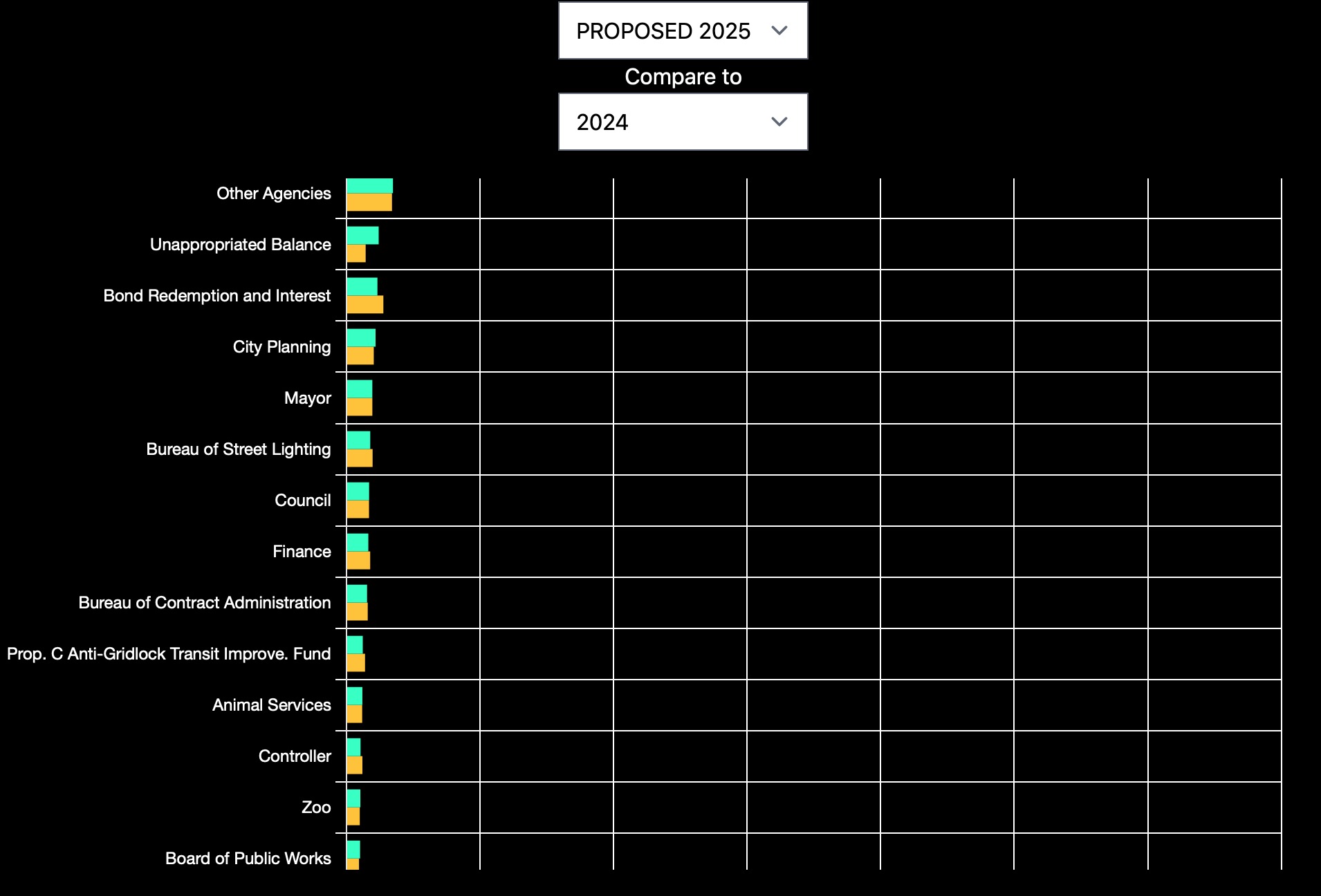 The following is part of a bar chart of department budgets. Yellow is 2024 and aqua is Proposed 2025. You have to scroll way down to find the Animal Services Department Budget (the bar chart goes from biggest department budget to smallest). Here's the relevant part of the bar chart.