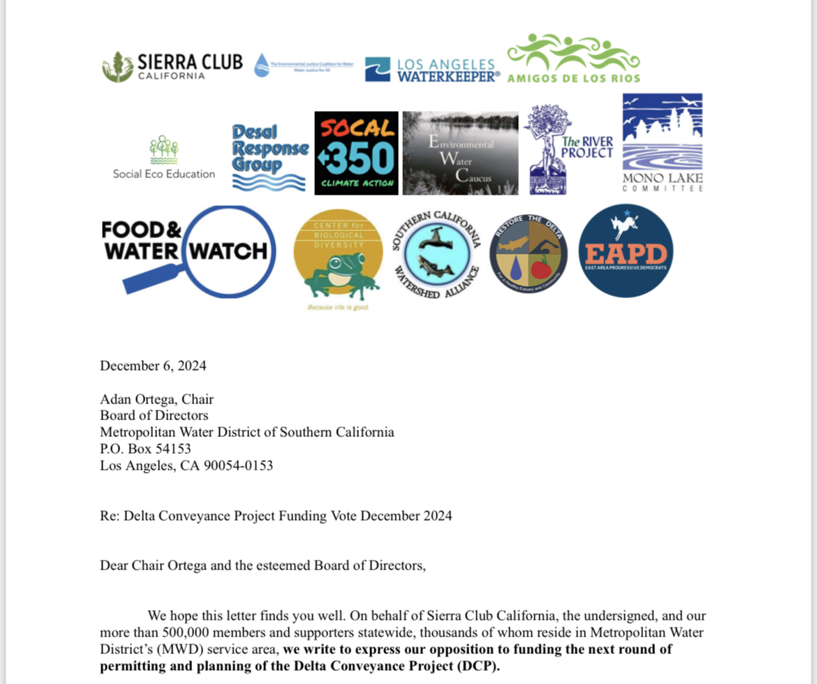 At least 15 organizations that work for environmental justice, including the Sierra Club and East Area Progressive Democrats (EAPD), urged the MWD board to reject another hasty decision to spend $142 million on the delta tunnel project. The 45-mile tunnel scheme has languished on a drawing board for more than 60 years and now has a total price tag of $20 billion.