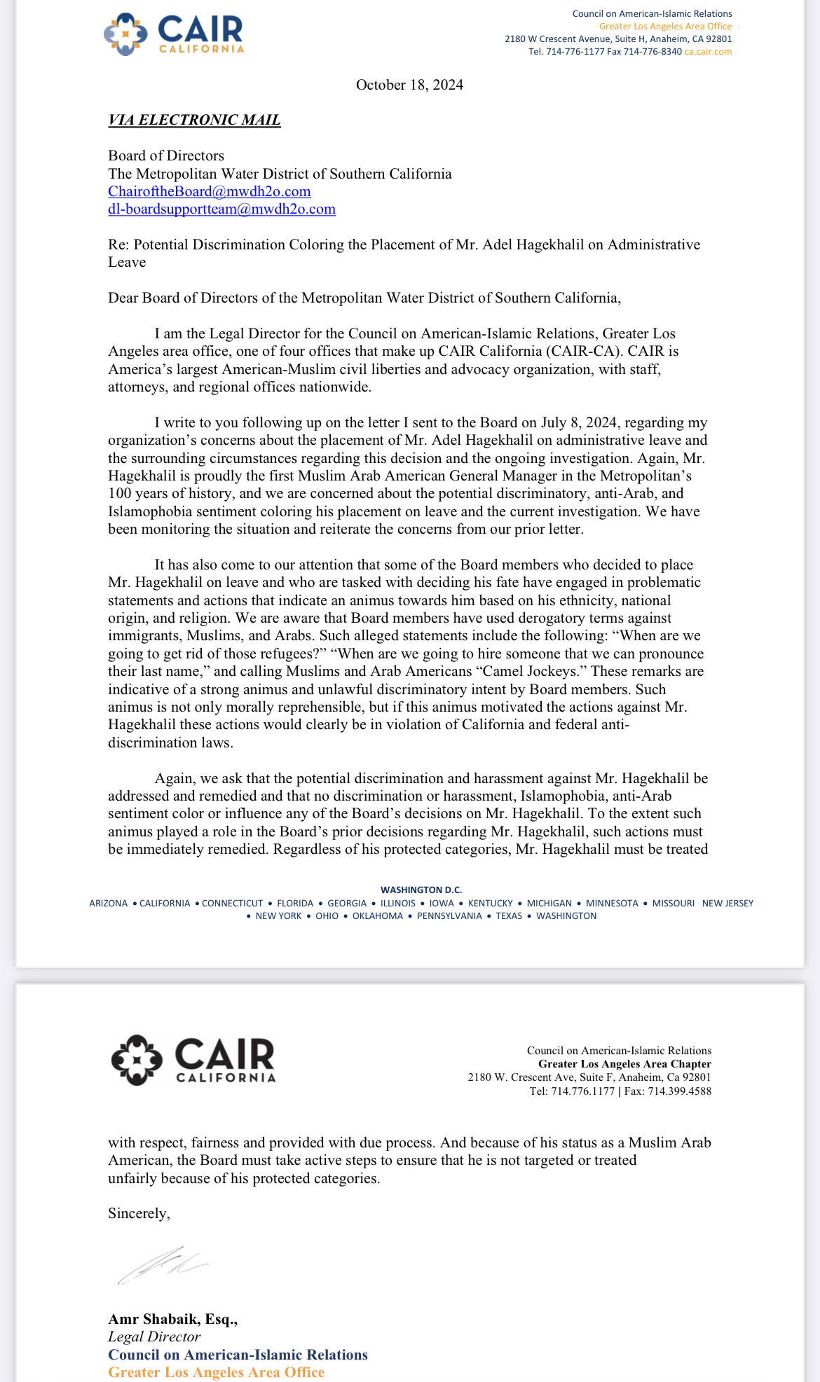 In addition to citing the anti-Arab slur by MWD Board Member John Morris, an October 2024 letter by the Council on American Islamic Relations (CAIR) highlights 2 other bigoted remarks targeting Arab Americans by MWD board members.
