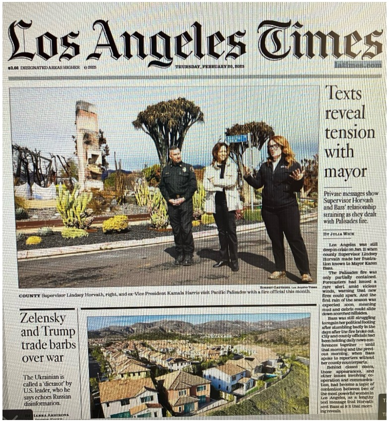 ANGRY ANGELENO - Yesterday, Wednesday, the LA Times had a story with equal sized headshots of Mayor Bass and County Supervisor (previously West Hollywood Council Member) Lindsey P Horvath side-by-side, regarding some sort of Texting Tussle about the Pacific Palisades Fire. It was first published at 3 AM in the early morning. A little after 5 PM, it was the Top Story on the Front Page of the LA Times website. A little before Midnight, it was STILL the Top Story.