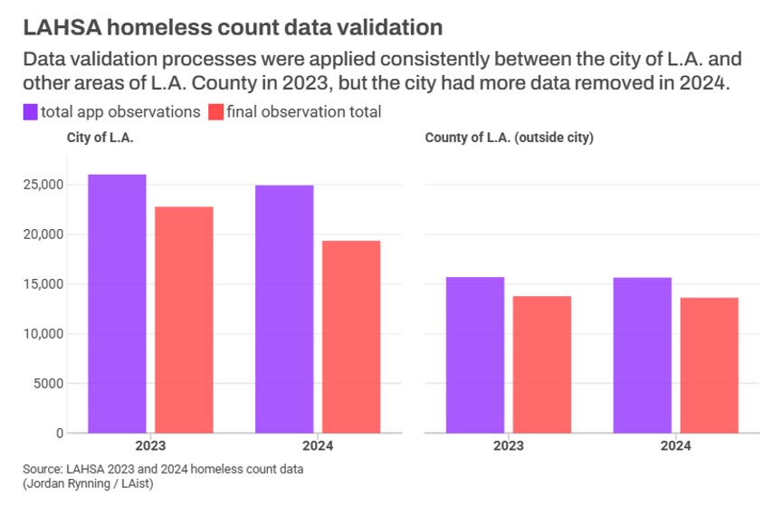 Although there have been many critical reports of LAHSA’s PIT count process in past years, the LAist article gives us a detailed account of the behind-the-scenes machinations that make the counts so questionable. According to the article, in 2024, hundreds, if not thousands, of unhoused people were missed in the count because LAHSA simply excluded them. Per the article, “LAist found nine areas — all inside Los Angeles city limits — where more than 100 observations of homelessness were removed from LAHSA’s preliminary totals of app and paper data by the time the count was finalized”. The text was accompanied by a chart showing the final count was reduced in 2023 and 2024 from initial counts reported by field volunteers.