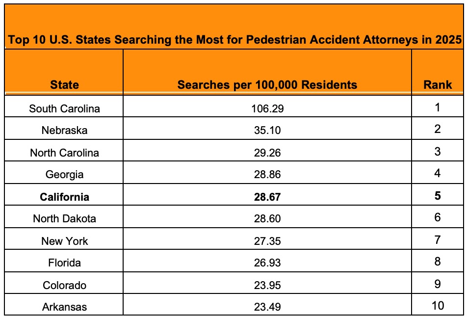 PEDESTRIAN ACCIDENTS - The study shows that California is the fifth-most active state for pedestrian accident attorney searches in 2025.