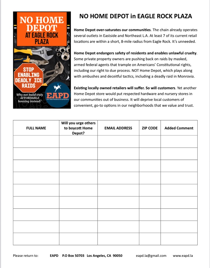 The petition, launched by East Area Progressive Democrats (EAPD) in November, follows California voters’ landslide approval of Prop 50 to push back against power-grabs by Donald Trump amid evidence of self-enrichment and corruption by his family and Administration. The measure passed by a nearly 2-to-1 margin statewide. It passed by a 3-to-1 margin in L.A. County, with overwhelming support from Democrats and independents and even from many Republicans. Local hardware retailers report that patrons across the ideological spectrum are signing the EAPD “NO Home Depot” petition.