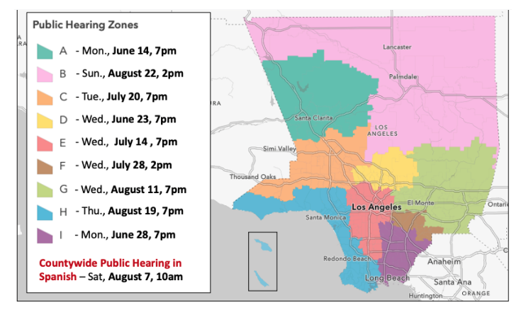 LOCAL GOVERNMENT-Above is a map of Los Angeles County with the dates of the Los Angeles County Redistricting Committee meetings by area.