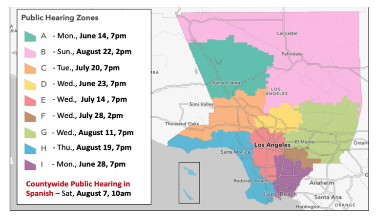 LOCAL GOVERNMENT-This is a map of Los Angeles County with the dates of the Los Angeles County Redistricting Committee meetings by area.