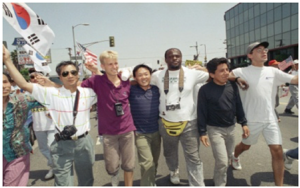 But the left continues to confront them. For the next hour, hostilities continue to ebb and flow. A right-wing guy shouts at an antagonist, "This is funded by Soros! You are fighting for the man! Do your research!" A Trump supporter pulls out a knife but backs down after being surrounded by opponents. A man blows bubbles over everyone. Both sides throw some more punches, but they have become less committed. People have been fighting for hours and most seem to be fading. A local man sets up an easel and begins painting the scene.