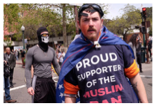 The right-wing side is almost entirely male. Some are dressed in motorcycle half helmets, ski goggles, gloves, and various forms of ghoulish masks. One is wearing a shirt that says "Proud Supporter of the Muslim Ban." Another's shirt says "Straight Pride." They aren't entirely white. A Latino man wearing a protective vest goes around shouting "Latinos for Trump!"